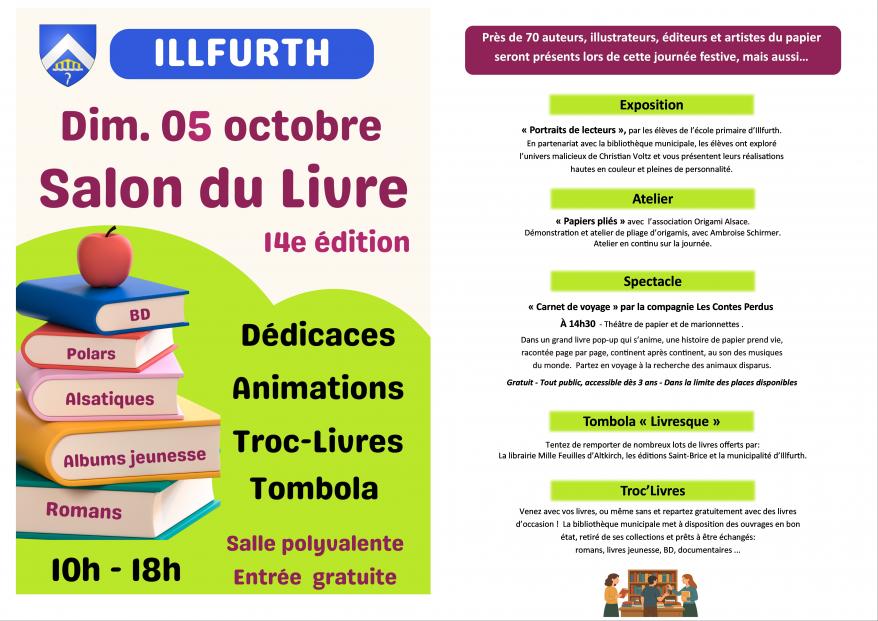 La municipalité et la bibliothèque municipale d’Illfurth organisent le Dimanche 5 Octobre la 14ième édition de son salon du livre.