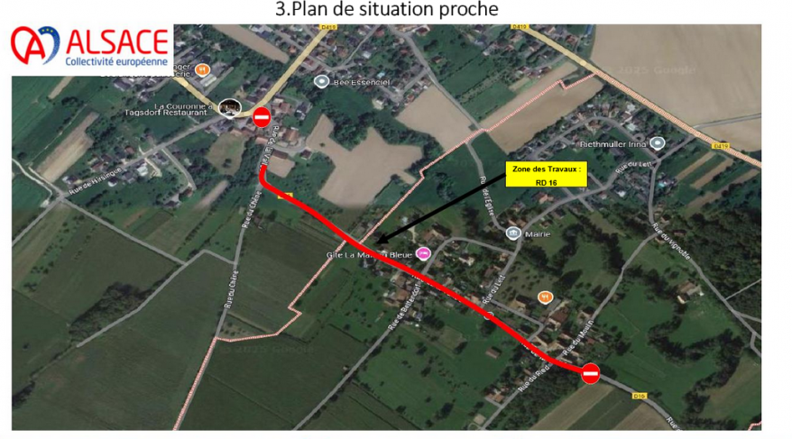 La Collectivité Européenne d'Alsace prévoit de renouveler le revêtement de chaussée de la RD16 dans la traversée d'agglomération de Schowben.