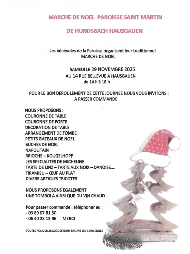 Le marché de Noël de la paroisse Saint Martin aura lieu le samedi 29 novembre 2025 de 14h à 18h au 14 rue Bellevue à Hausgauen.