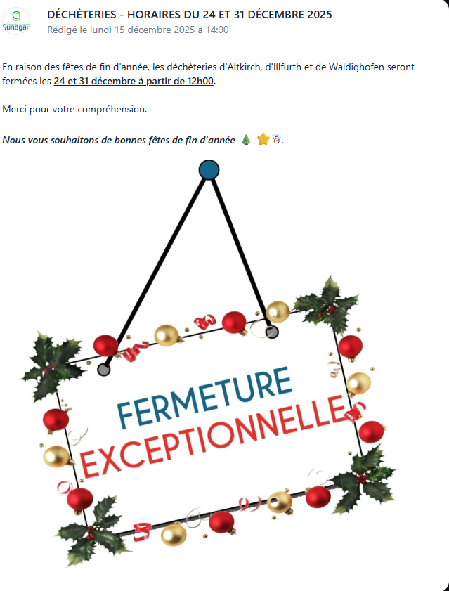 En raison des fêtes de fin d'année, les déchèteries d'Altkirch, d'Illfurth et de Waldighofen seront fermées les 24 et 31 décembre à partir de 12h00.