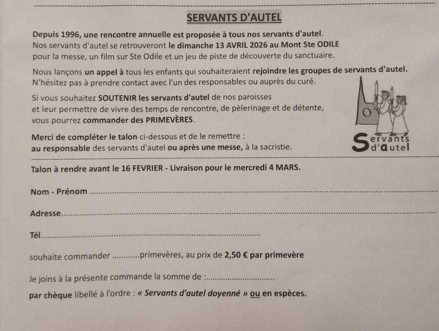 Pour soutenir les servants d’autel de nos paroisses et leur permettre de vivre une belle journée de rencontre, pèlerinage et détente, achetez des primevères au prix de 2,50 € l’unité.