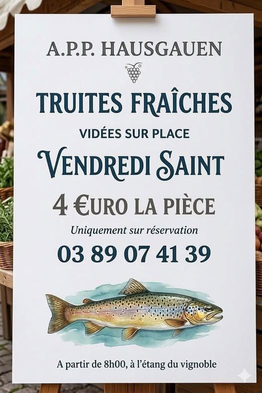 L'A.P.P. Hausgauen vous propose sa traditionnelle vente de truites fraîches, vidées sur place, le vendredi Saint.